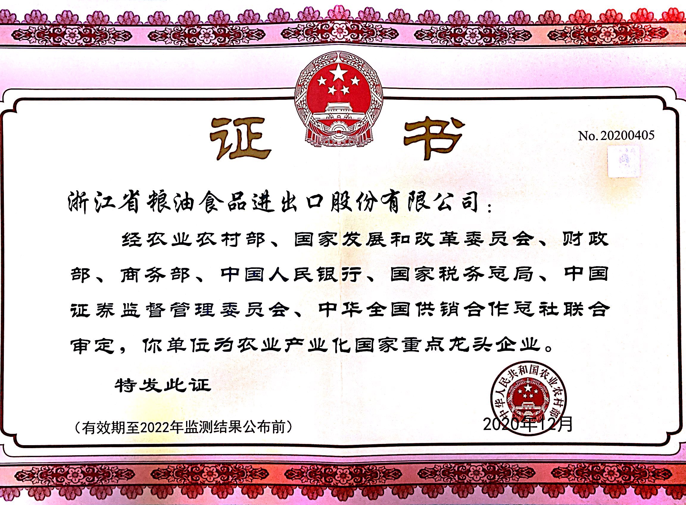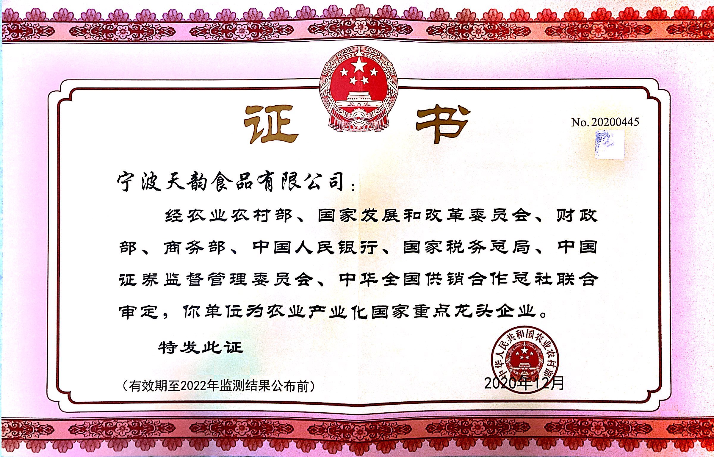 近期,經(jīng)農(nóng)業(yè)農(nóng)村部、國(guó)家發(fā)展和改革委員會(huì)、財(cái)政部、商務(wù)部、中國(guó)人民銀行、國(guó)家稅務(wù)總局、中國(guó)證券監(jiān)督管理委員會(huì)、中華全國(guó)供銷合作總社聯(lián)合審定,公司與寧波天韻食品有限公司雙雙順利通過第九次農(nóng)業(yè)產(chǎn)業(yè)化國(guó)家重點(diǎn)龍頭企業(yè)監(jiān)測(cè)復(fù)評(píng)。